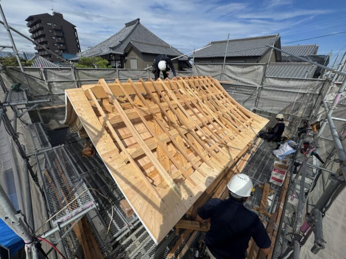 愛知県津島市にて山門新築をさせて頂いております。 材料は総桧造りで木材は当社で丸太から自社で製材をする事で1本1本吟味選定しながら使用しました。 使用する木材は当社で何年も乾燥させた木材を使用することにより、何年経っても狂いの少ない建物となります。 そうする事で堅牢な建築物となりいつまでも美しい屋根の反りを維持する事が出来ます。